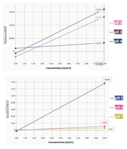 To complement visual observations, absorbance was measured at 380 nm using a Vernier SpectroVis spectrophotometer. Baseline absorbance of each buffer solution was recorded before capsule addition, and post-exposure absorbance was measured after 30 minutes. The qualitative endpoint was defined as the change in absorbance, where higher values were interpreted as greater release into solution. For each pH condition, baseline absorbance of the buffer solution was measured before capsule addition. After 30 minutes of incubation, post-exposure absorbance was recorded. The qualitative endpoint was defined as the change in absorbance, where higher values were interpreted as greater release of encapsulated material into solution.